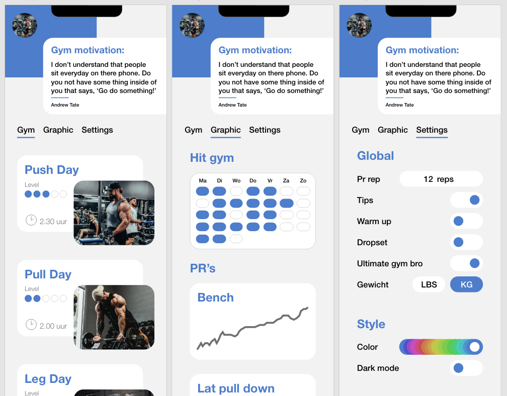 Design en development gedaan van Ultimate Gym Bro. Sportapp die jou met alles helpt om zo veel mogelijk spieropbouw te laten hebben. Dit is aangestuurd door AI en databerekeningen.